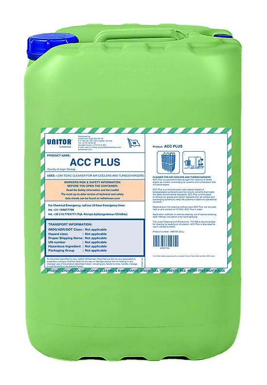 Unitor? ACC Plus is a powerful micro emulsion based cleaning agent for cleaning of diesel engine air coolers, scavenging air systems and the compressor side of turbochargers.