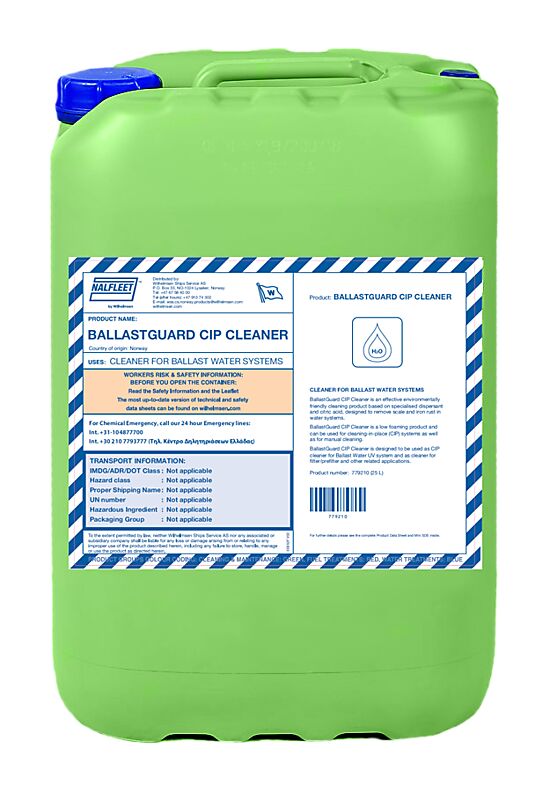 NALFLEET? BALLASTGUARD CIP CLEANER is an effective environmental friendly cleaning product based on specialised dispersant and citric acid. The product is designed to remove scale and iron rust. BallastGuard CIP Cleaner is designed to be used for Ballast Water System cleaning-in-place (CIP) cleaning Prefilter/filter cleaning and other related applications.