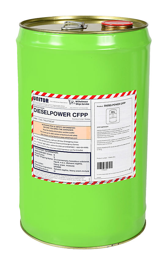 Unitor? DieselPower? CFPP improve cold weather operability and cold flow properties of marine distillate fuels. Unitor? DieselPower? CFPP help to reduce the size of waxes formed and reduce the risk of wax sedimentation in fuel tanks.