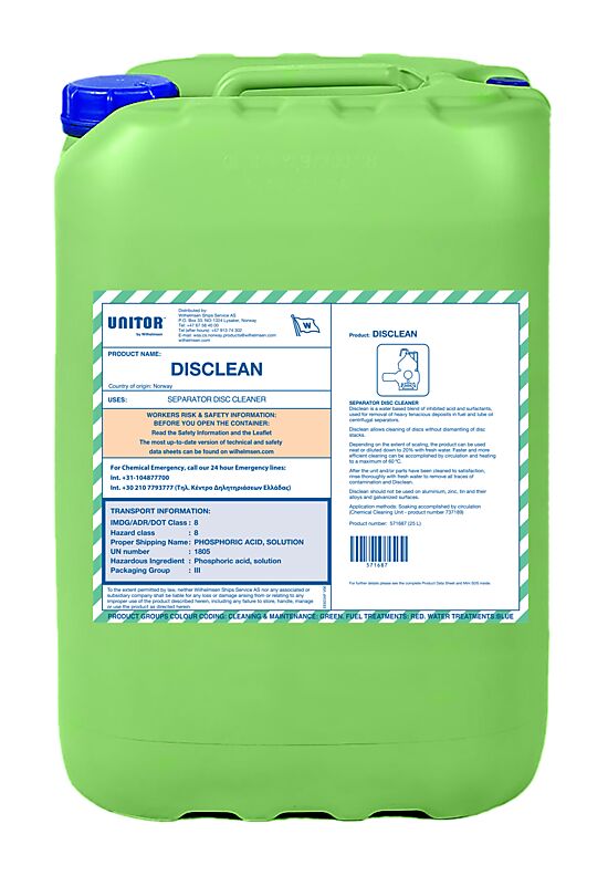Unitor? Disclean? is a water based blend of inhibited acids, surfactants and emulsifying agents for cleaning of separator discs.