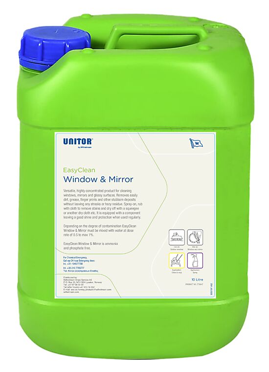The Unitor? EASYCLEAN? WINDOW & MIRROR is a versatile, extra strength product for cleaning windows, mirrors and other glossy surfaces of the galley and accommodation areas.