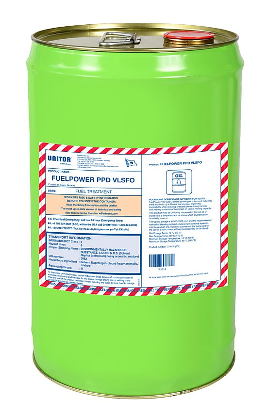 Unitor? FuelPower? PPD VLSFO is an excellent product for cold weather operability with marine residual fuel, both HSFO and VLSFO Unitor? FuelPower? PPD VLSFO help to reduce the size of waxes formed and reduce the risk of wax sedimentation in fuel tanks.