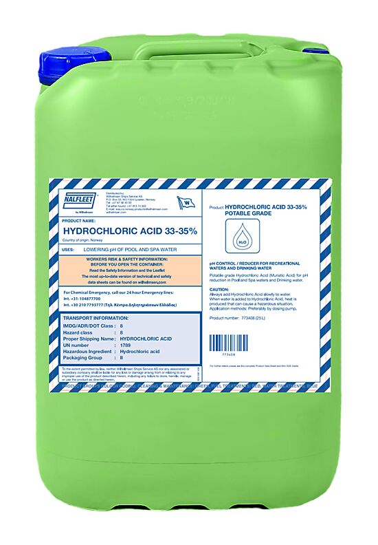 Potable grade Hydrochloric Acid (Muriatic Acid) for pH reduction in Pool and Spa waters and Drinking water. **CAUTION:** Always add Hydrochloric Acid slowly to water. When water is added to Hydrochloric Acid heat is produced that can cause a hazardous situation. Application methods: Preferably by dosing pump.