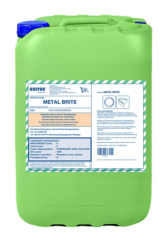 Unitor? Metal Brite? is a liquid detergent compound containing rust dissolving acids, emulsifiers and passivators.