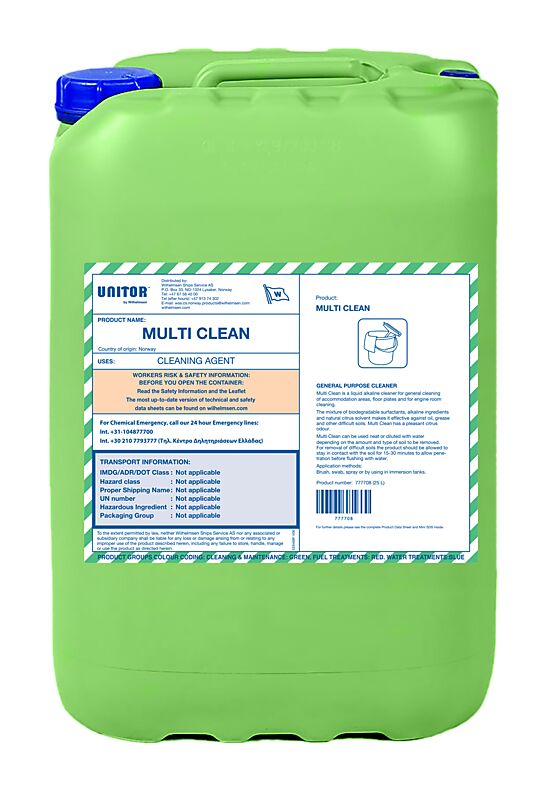 Unitor? Multi Clean? is a concentrated alkaline cleaner that is ideal to use for general cleaning of deck areas, floor plates and engine room cleaning with a pleasant citrus odour.
