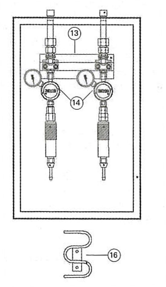 The secondary regulator will regulate the acetylene pressure from the distribution piping to the twin-hose. Outlet station spare part corresponding to Position 14 in the drawing.