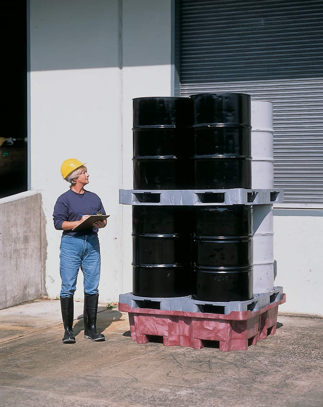 The Ultra-Spill King combines the best of spill containment with the best of material handling. The four-drum spill containment pallet simplifies drum handling and containment by combining a forkliftable top pallet with a forkliftable bottom sump.