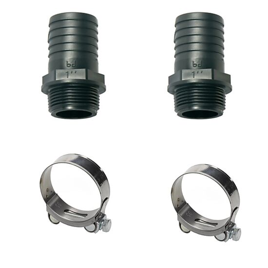 This Hose Barb Connectors Kit, designed for the UNITOR? Aeroflow Double Diaphragm Pump (1-inch PP), includes 2 fluid hose barbs 1?, and 2 clamp collars to ensure a secure and durable fluid connection.