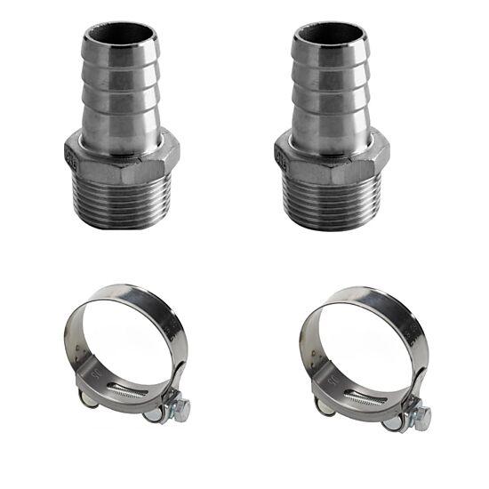 This Hose Barb Connectors Kit, designed for the UNITOR? Aeroflow Double Diaphragm Pump (1-inch SS/ALU), includes 2 fluid hose barbs 1?, and 2 clamp collars to ensure a secure and durable fluid connection.