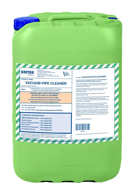 Unitor? Vacuum Pipe Cleaner? is an effective liquid treatment used to remove build up of inorganic scale in vacuum toilet piping systems.